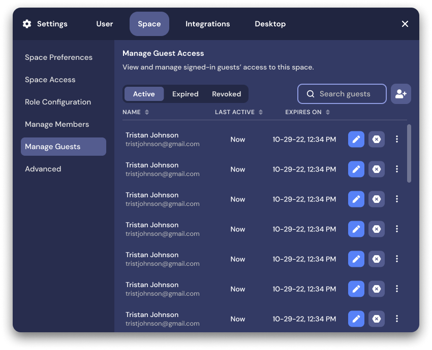 From here you can view Active, Expired, and Revoked guest access, manage current guests, and add new ones.