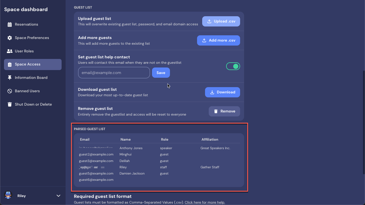 Once your guest list is ready, open your Space Dashboard. Select Space Access in the Left Nav Menu. Scroll down to the Guest List section and select Upload .csv to upload your guest list file.